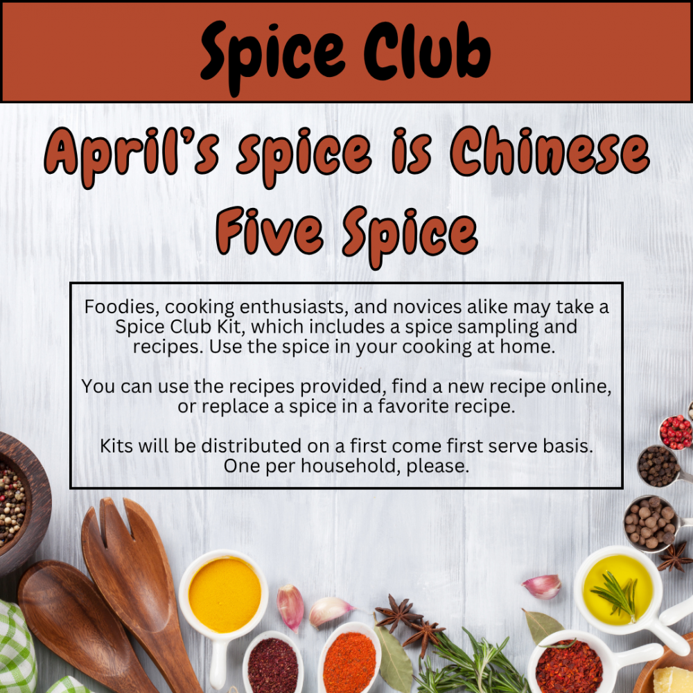 Foodies, cooking enthusiasts, and novices alike may take a Spice Club Kit, which includes a spice sampling and recipes. Use the spice in your cooking at home.