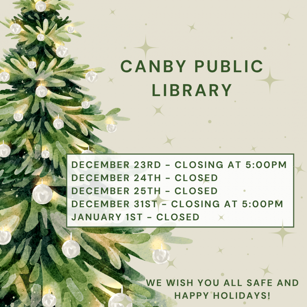 The Canby Public Library will be CLOSED on December 24th for Christmas Eve.